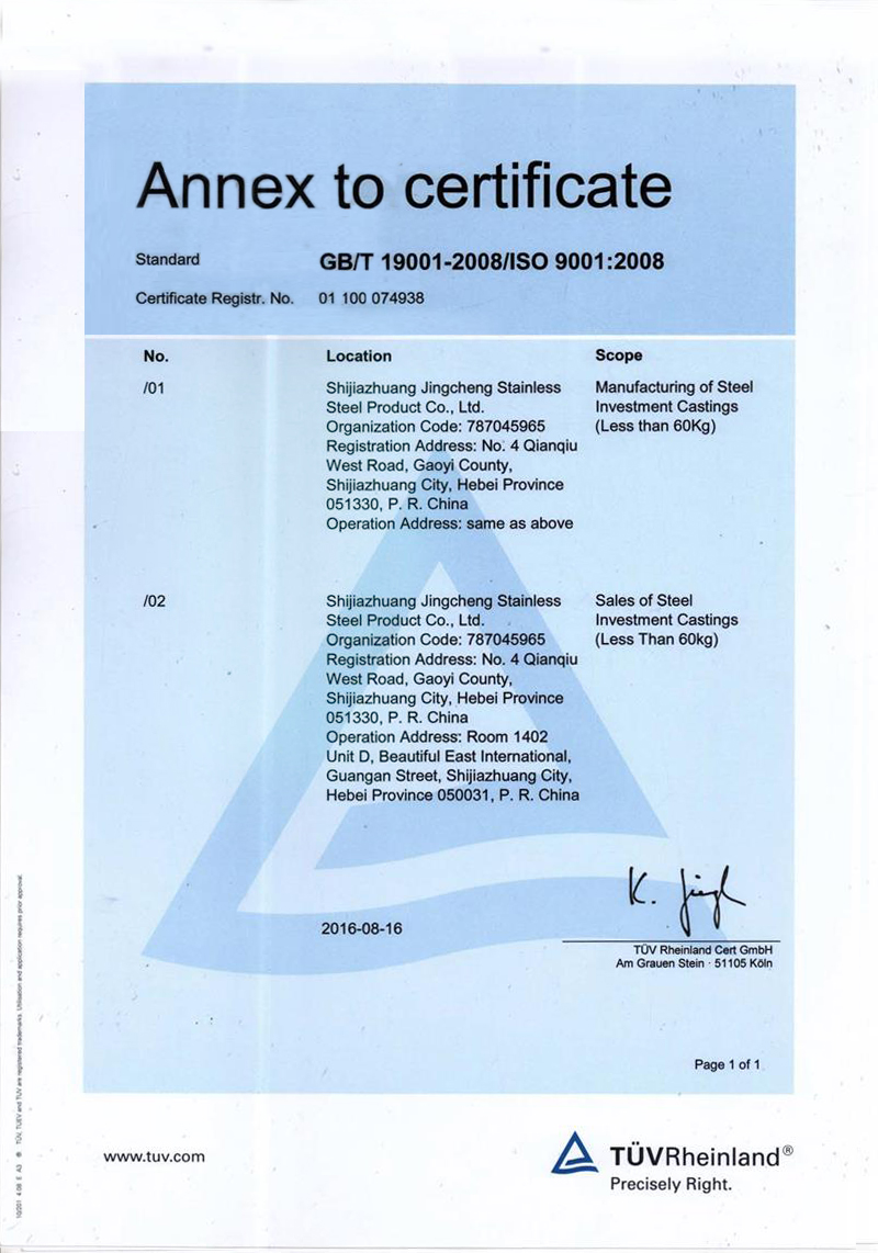 石家莊市精誠不銹鋼制品有限公司,是一家從事專業(yè)精密鑄造的企業(yè)。主要生產(chǎn)不銹鋼、合金鋼、低碳鋼及各種特種合金材質(zhì)的精密鑄件及加工產(chǎn)品。